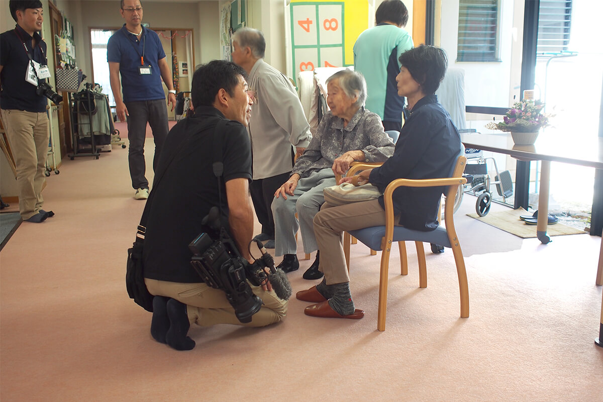 到着後、古田さんは準備をしつつ、取材対象となる方や施設の職員さんと自然に言葉を交わす。笑顔も見られ、和やかな雰囲気だ。