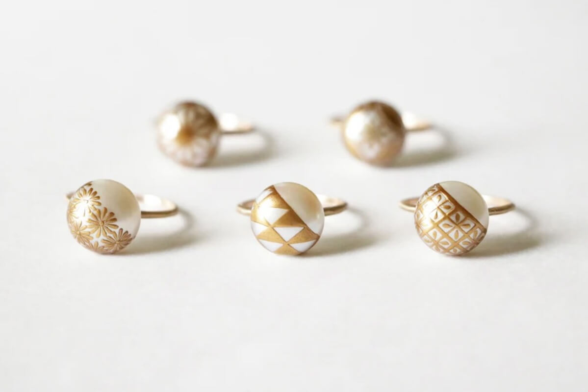 一つひとつ丁寧に彫られた和彫の結婚指輪、江戸切子のピアスや蒔絵をまとったパールのイヤリング。