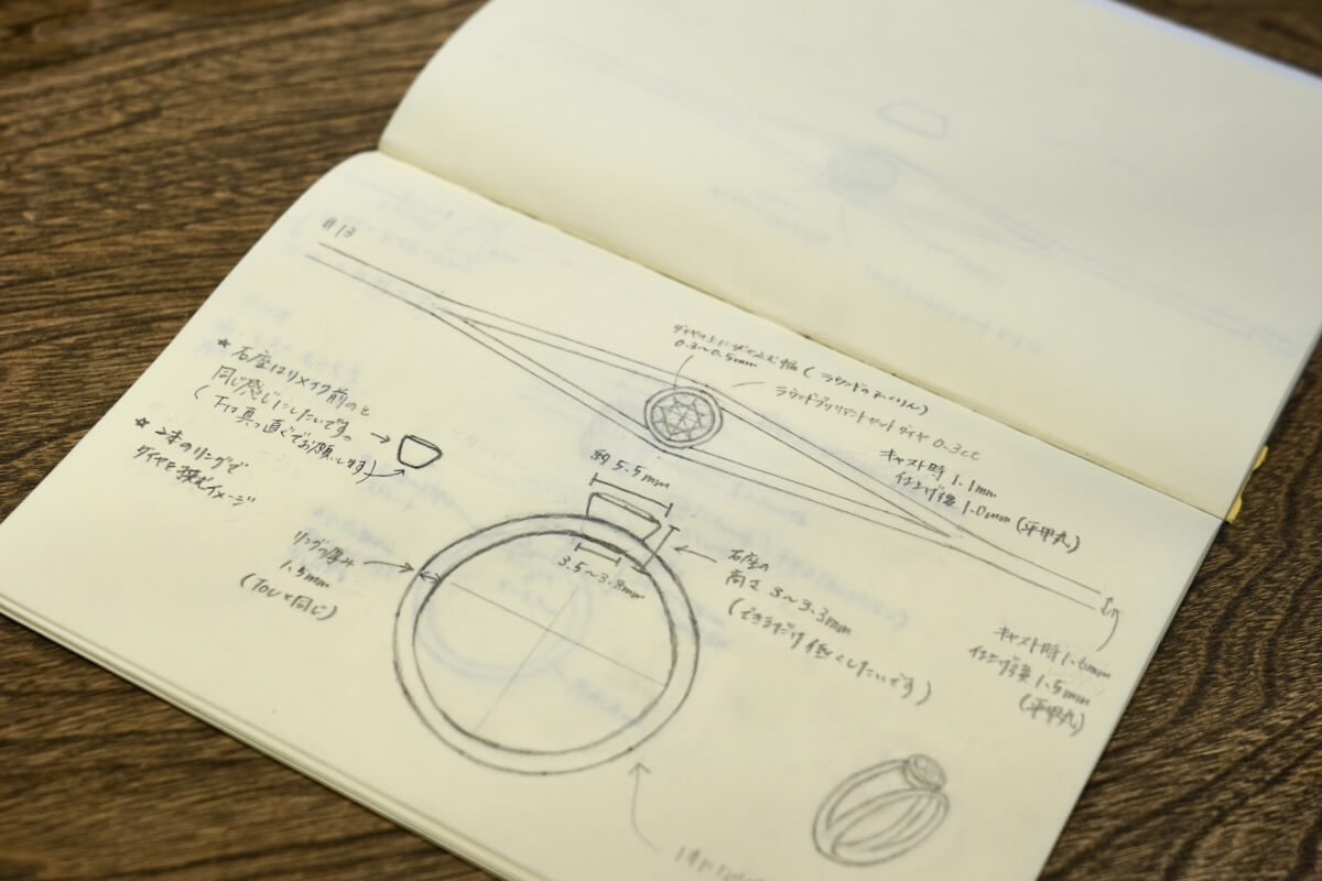 ベースの形はどうしたいか、ダイヤはあまり高さを出さないほうがいいかなど、お客さんの要望を細かく聞いて、デザインに書き起こしていく。最終的には2本の細いリングでダイヤを挟むような、シャープな形に仕上がった。