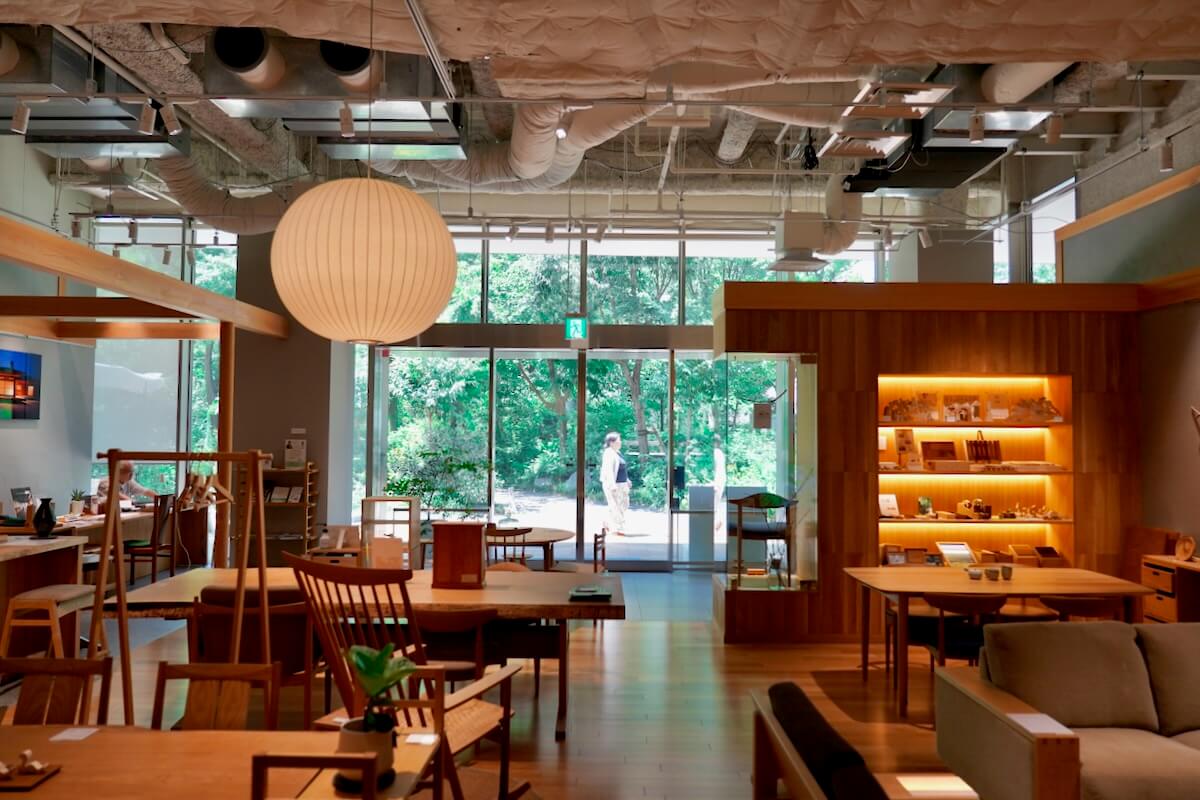 店内には、ナラやケヤキの無垢材でつくられたテーブルや椅子が並び、やわらかな木の香りが漂う。