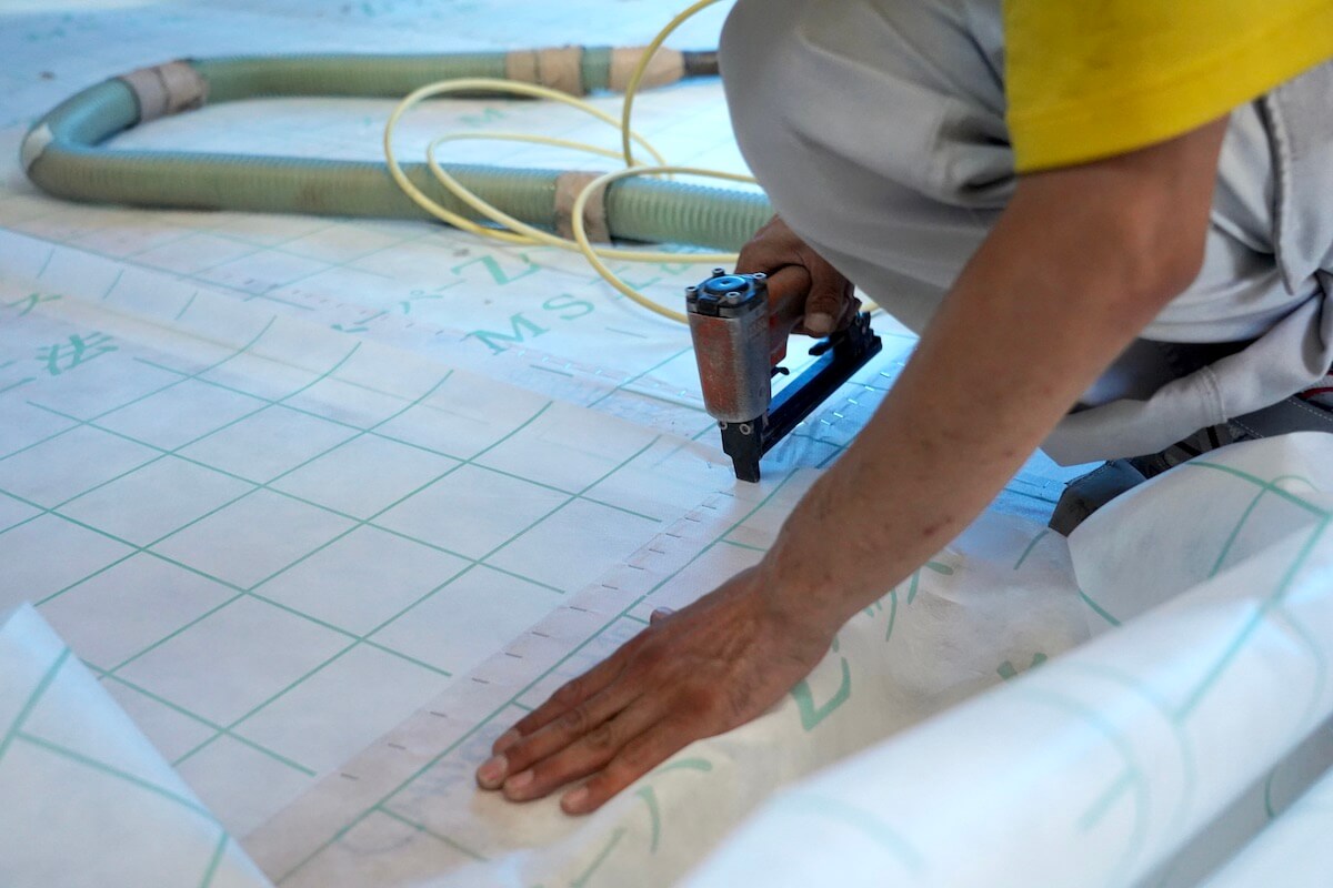 まずは、断熱材を入れるスペースをつくるための、「貼り」の作業。タッカーと呼ばれる大きなホチキスのような機械を使って、専用のシートを壁や床などに貼り付けていく。