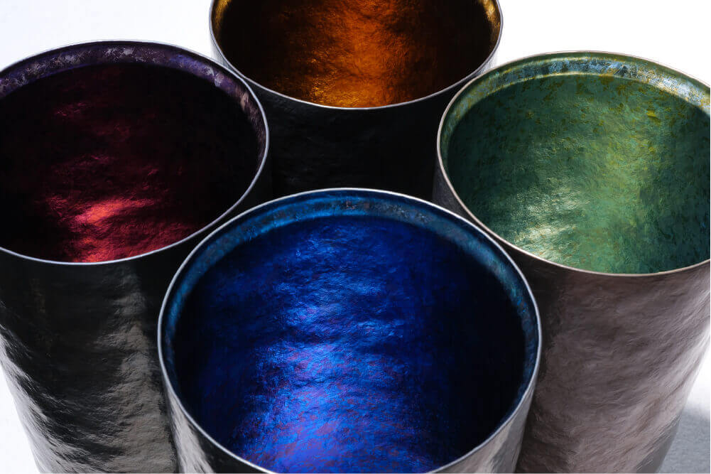 多彩な色は、着色ではなく、金属の表面にある酸化皮膜の厚みをナノメートル単位で調整し、表現されている。