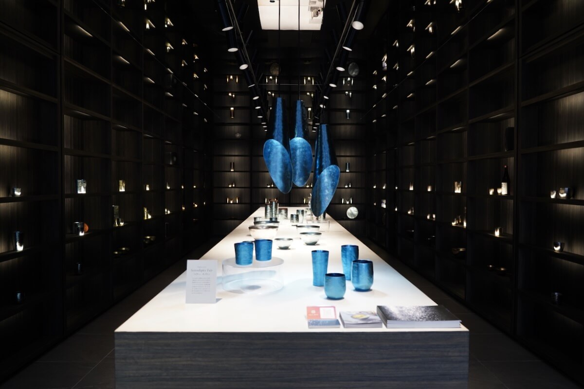 黒を基調とした店内には、商品が一つひとつ綺麗に棚に陳列されていて、中央にある商品のブルーが映えている。