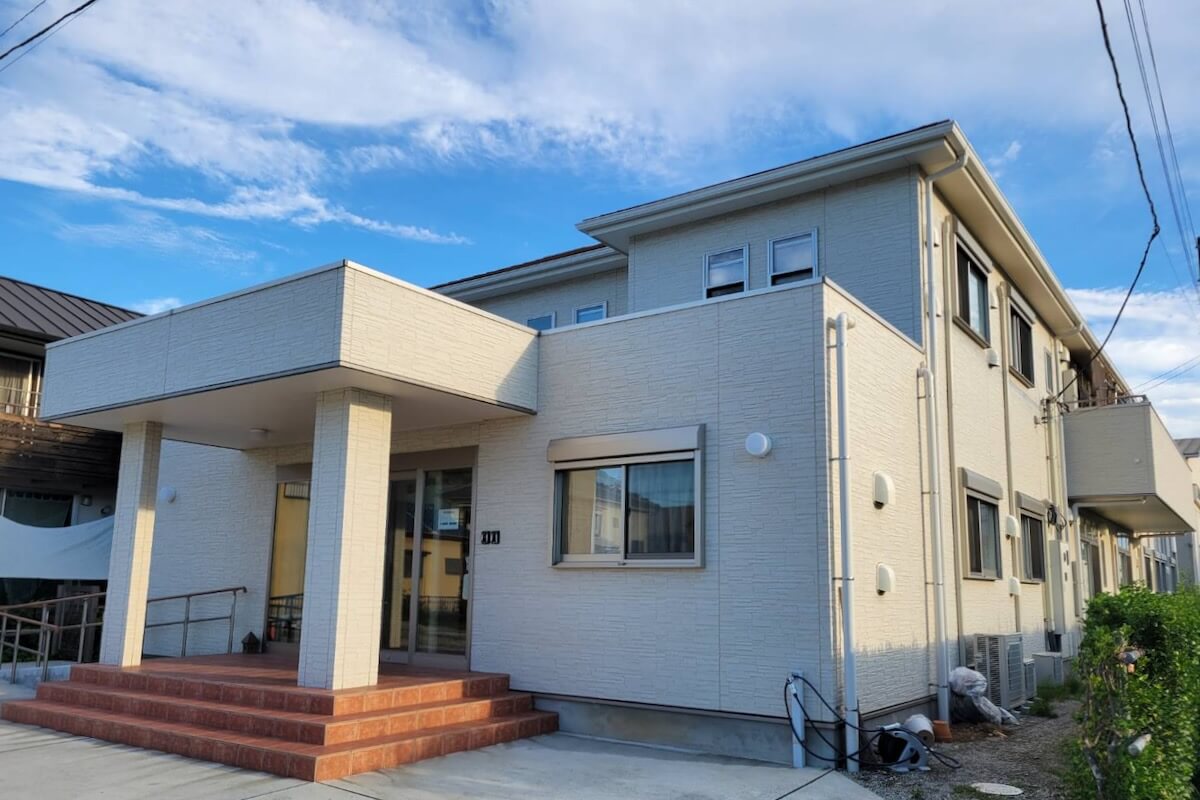 二宮駅に到着後、スタッフさんの車で施設へ向かう。5分ほどで、白い2階建ての施設が見えた。ここが湘南ユイット。