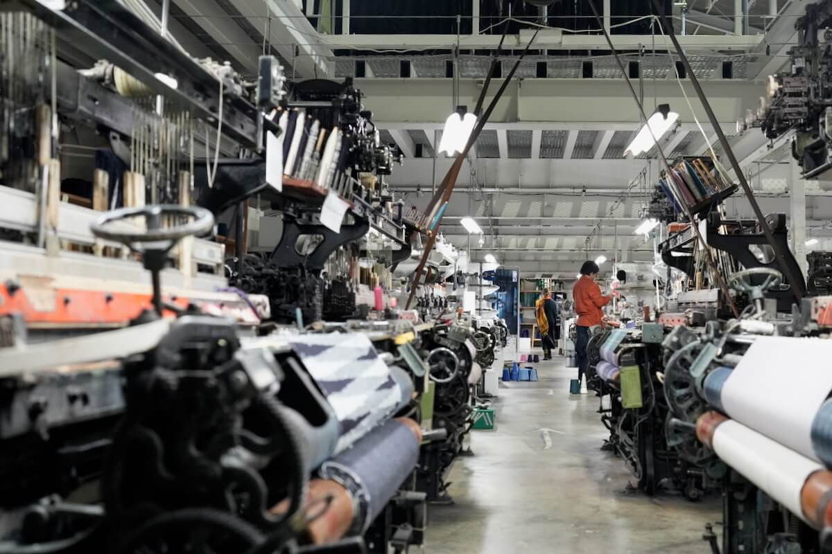 ショップの奥には、ガシャンガシャンと織り機が動く音のなかで、テキパキと仕事をするスタッフの姿。