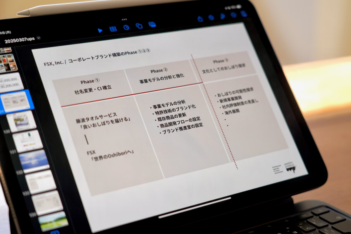 会社のことを理解し、話を聞いていくうちに、まずは会社の目指す方向性やメッセージを見直すほうが大事だと考え、事業の軸の整理と戦略づくりからはじめることに。