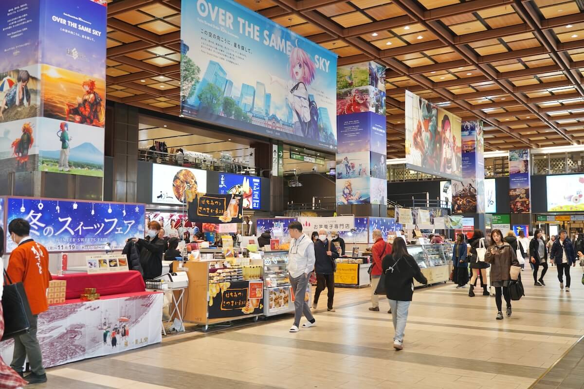 改札を出てエスカレーターを降りると、日本各地の名産品が並んでいる。仙台駅は東北の玄関口として、さまざまな情報が集まるエリアだ。