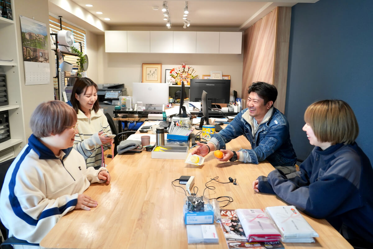 扉を開けると、打ち合わせスペースのテーブルを囲んでいたのは、代表の齊藤夫妻と、前回の記事を読んで入社した山口さんと石塚さん。