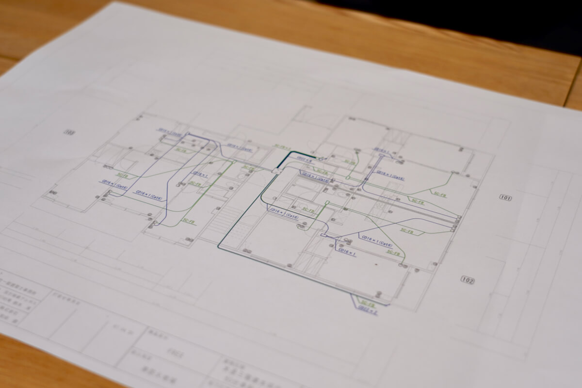 仕事の流れとしては、まず事務スタッフが依頼を受けて見積もりを作成し、照明やコンセントの配置を図面に起こす。そして東京電力や国への申請を行う。