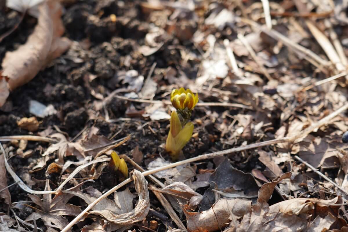落ち葉をかき分けると、福寿草の芽がぽっと顔を出している。小さくも、たくましい。