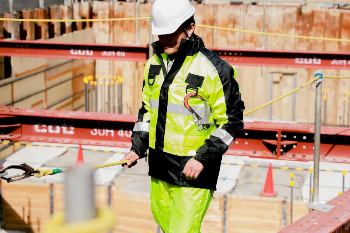 たとえば、高所作業用のモデルなら、転落防止のハーネスの上から着用でき、反射材や蛍光色を用いたデザインにより遠くからも作業員を視認しやすい。