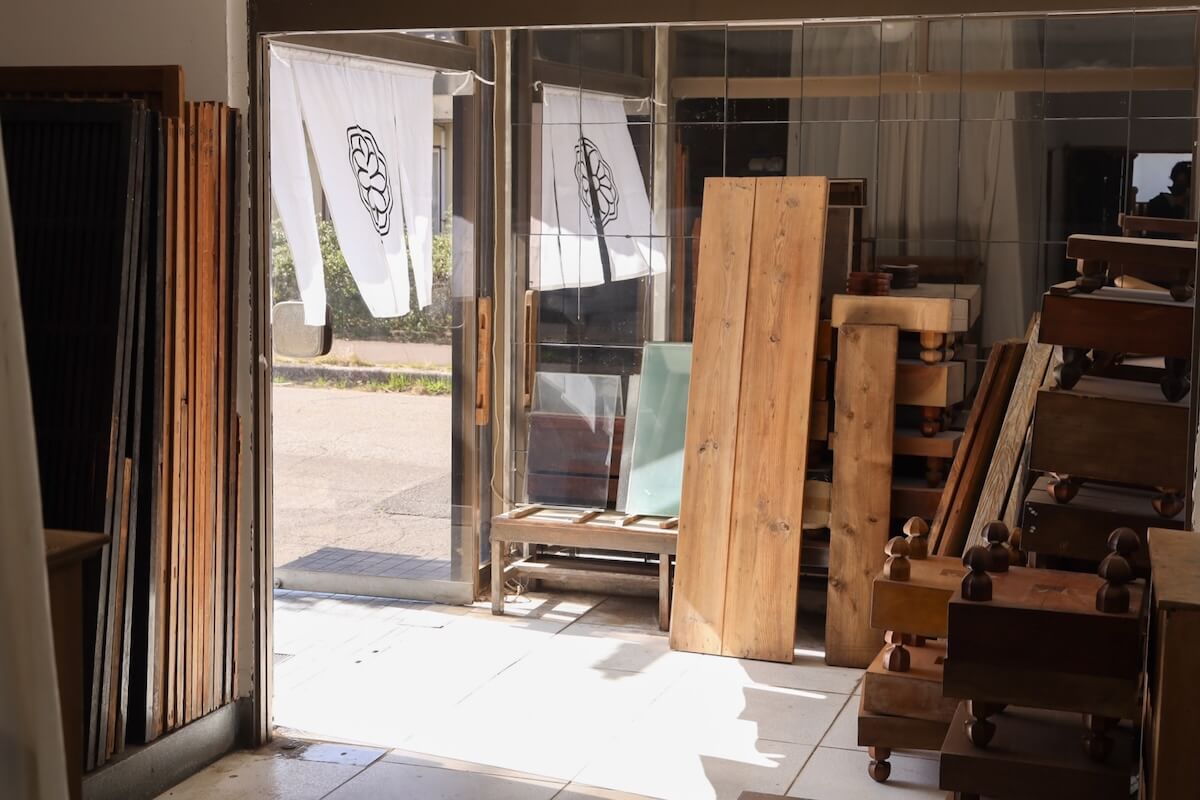 入口には、使い古された碁盤や板、棚たちが並ぶ。直されるのを静かに待っているよう。