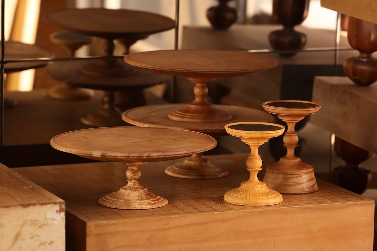 オリジナル商品は、ろくろ脚のキャンドルスタンドやケーキスタンドを中心に製作。使われなくなった碁盤をアップサイクルしている。